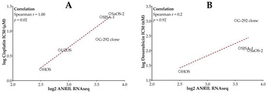 Increased ANRIL expression correlates with increased resistance to both cisplatin (A) and doxorubicin (B) in osteosarcoma cell lines. In vitro drug response data were obtained from the Genomics of Drug Sensitivity in Cancer version 1 dataset (GDSC1; https://www.cancerrxgene.org/ release 8.3, June 2020) accessed on 4 June 2020. Measured ANRIL expression was obtained from the Cancer Cell Line Encyclopedia (CCLE, https://portals.broadinstitute.org/ccle/data, release date 1 February 2019) accessed on 4 June 2020. X-axis displays ANRIL expression after log2 transformation. Y-Axis displays the reported therapeutic IC50 (µM) value after log transformation.