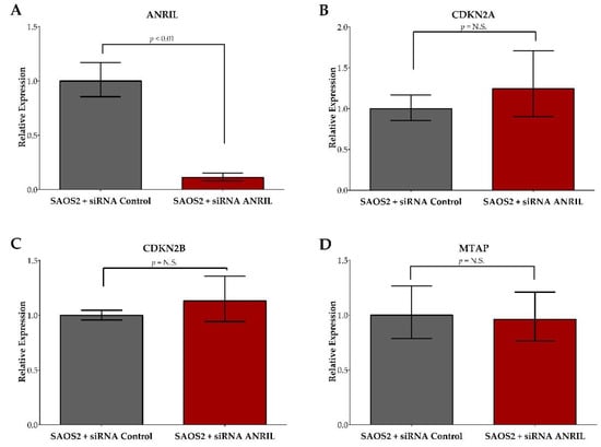 In vitro validation of lncRNA ANRIL knockdown in SAOS2 cells after siRNA transfection. SAOS2 cells transfected with ANRIL siRNA displayed an 88.9% decrease in ANRIL expression compared to control cells (A). No significant changes in gene expression of CDKN2A (B), CDKN2B (C), or MTAP (D) were observed between SAOS2 cells transfected with ANRIL siRNA and control. Red bars indicate relative expression generated from SAOS2 cells transfected with ANRIL siRNA. Grey bars indicate relative expression generated from SAOS2 transfected with control siRNA.