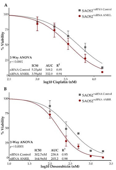 ANRIL knockdown increases the sensitivity to cisplatin and doxorubicin in osteosarcoma. Dose–response curves of SAOS2 cells transfected with either ANRIL siRNA or control measured at 72 h post-treatment with either cisplatin (A) or doxorubicin (B). Y-axis displays percent viability. X-axis displays log-transformed treatment concentrations. ANRIL knockdown SAOS2 cells are represented by lines and circles shaded in red. Control siRNA SAOS2 cells are represented by lines and squares shaded in grey. Each experimental condition was performed in triplicate and measurements were reported as the mean ± standard deviation (S.D.) of three independent biological experiments. Dose points with minimal error (S.D. < 2) show no visible error bars.