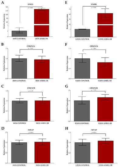 In vitro validation of lncRNA ANRIL overexpression in stable overexpression models. HOS cells containing stable ANRIL overexpression showed a 114-fold increase in ANRIL expression compared to the control (A). U2OS cells containing stable ANRIL overexpression showed a 60-fold increase in ANRIL expression compared to the control (E). No significant changes in gene expression of CDKN2A, CDKN2B, or MTAP were observed between the ANRIL overexpression and control models for HOS (B–D) or U2OS (F–H). Red bars indicate relative expression generated from ANRIL overexpression models. Grey bars indicate relative expression generated from empty vector controls.