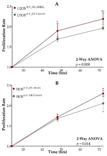 Overexpression of ANRIL increases cell proliferation. U2OS cell line models are shown in panel (A). HOS cell line models are shown in panel (B). Y-axis displays proliferation rate. X-axis displays time of measurement in hours. Calculated measurements of proliferation were normalized to measurements taken at 24 h after cell plating. ANRIL overexpression models are represented by lines and circles shaded in red. Empty vector expression control models are represented by lines and squares shaded in grey. * student t-test p-value < 0.05. ** student t-test p-value < 0.01.