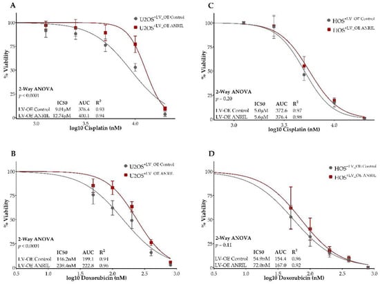 ANRIL overexpression decreases the sensitivity to cisplatin and doxorubicin in osteosarcoma. Dose–response curves of ANRIL overexpression U2OS lines treated with cisplatin or doxorubicin are displayed in panels (A,B). Dose–response curves of ANRIL overexpression HOS lines treated with cisplatin or doxorubicin are displayed in panels (C,D). Y-axis displays percent viability. X-axis displays log-transformed treatment concentrations. ANRIL overexpression models are represented by lines and circles shaded in red. Empty vector control models are represented by lines and squares shaded in grey. Each experimental condition was performed in triplicate and measurements were reported as the mean ± standard deviation (S.D.) of three independent biological experiments. Dose points with minimal error (S.D. < 2) show no visible error bars.