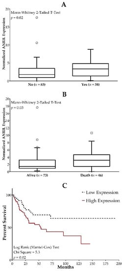 The role of lncRNA expression in osteosarcoma prognosis was examined utilizing the TARGET osteosarcoma database. Survival outcomes, metastases at diagnosis, and percent necrosis were evaluated in osteosarcoma patients (n = 86 and n = 43 for OS/metastases and percent necrosis, respectively) with various ANRIL expression levels. We found that higher ANRIL expression was significantly associated with increased incidences of metastases at diagnosis and death (Figure 7A,B). The survival curve showed that high ANRIL expression was a significant predictor of a reduced overall survival rate (Figure 7C). ANRIL expression did not predict % necrosis (p = 0.2).