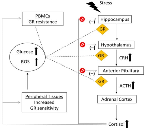 It is important to mention that hyperglycemia resulting from streptozotocin-induced diabetes increases the activity of the HPA axis, while normalizing glucose with either insulin or phloridzin corrects this hyperactivity [131,132]. Moreover, ingestion of glucose increases serum and salivary cortisol levels in healthy adults [133,134,135,136], suggesting that glucose can promote a GC resistance state [136]. The signaling pathways that are directly triggered by hyperglycemia, probably through alterations in CLOCK genes and acetylation of GR or due to the hyperglycemia-induced production of ROS and oxidative stress may result in a GR resistant state [136,137,138]. Based on above and bearing in mind that ROS, oxidation status and alterations in CLOCK genes impair GR function, one may propose the following model for the relationship between stress, hypercortisolism, hyperglycemia and GR resistance in immune and brain cells. According to this, an impaired brain GR signaling results in HPA hyperactivity, hypercortisolism, and hyperglycemia. Hyperglycemia-induced production of ROS and oxidative stress, in turn, impair GR function in immune cells as well as in brain cells resulting in further blunting of HPA axis and hypercortisolism in T2D, creating a vicious cycle (Figure 1).