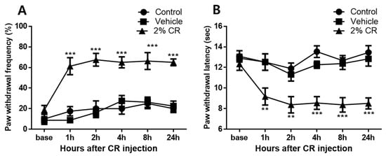 Graphs show the development of mechanical allodynia and thermal hyperalgesia in ipsilateral hind paws with 2% carrageenan (intraplantar) treatment. (A) No significant changes in paw withdrawal frequency (%) were observed in saline-treated animals (Vehicle, n = 8) over the 24 h experimental period compared to that in control animals (Control, n = 8). In contrast, the carrageenan injection group (2% CR, n = 8) exhibited a significant increase in paw withdrawal frequency in the hind limbs from 1 to 24 h after carrageenan injection, which underscores the robust development of mechanical allodynia induced by carrageenan (*** p < 0.001 compared to control mice). (B) No significant changes in paw withdrawal latency (sec) were observed in saline-treated animals over the 24 h experimental period compared to that in control animals. Carrageenan injection significantly decreased paw withdrawal latency from 1 to 24 h in the ipsilateral hind paw (** p < 0.01, *** p < 0.001 compared to control mice).