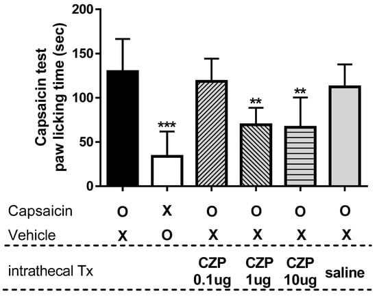 The graph shows the paw-licking time after intrathecal capsazepine administration in a mouse model of capsaicin-induced spontaneous pain. Intraplantar injection of capsaicin (capsaicin, n = 6) induced paw-licking behavior characteristic of nociception, while saline-injected animals (Vehicle, n = 6) exhibited significantly less paw-licking behavior compared to capsaicin-injected animals (*** p < 0.001). Doses of 1 and 10 μg of capsazepine (CZP 1 μg and CZP 10 μg, n = 6, respectively) significantly suppressed capsaicin-induced paw-licking time compared to that in capsaicin-injected mice (** p < 0.01), whereas a dose of 0.1 μg of capsazepine (CZP 0.1 μg, n = 6) and intrathecal administration of sterile saline (saline, n = 6) did not result in significant changes in paw-licking time.