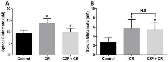 Assessment of serum glutamate concentration revealed that glutamate levels were significantly increased after carrageenan injection (2% CR) and capsazepine administration (CZP 1 μg) compared to those in the control group (Control, * p < 0.05), but no significant differences were observed in serum glutamate concentration between capsazepine-treated mice and carrageenan-treated mice (Figure 4B).