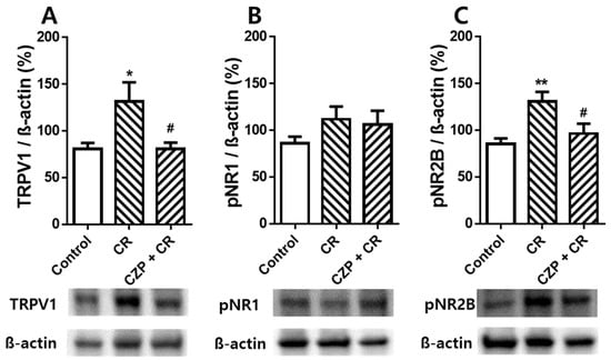 Graphs show the effects of intrathecal capsazepine treatment on TRPV1 (A), pNR1 (B), and pNR2B (C) expression in the lumbar spinal cord of mice with carrageenan-induced inflammation. TRPV1 expression in the spinal cord was significantly higher in carrageenan-injected animals (CR, n = 6) than in the control group (Control, n = 6, * p < 0.05) and was significantly lower in intrathecal capsazepine-treated animals (CZP + CR, n = 6) than in the carrageenan-injected group (# p < 0.05). pNR1 expression levels in the spinal cord were not significantly different among control, carrageenan-injected, and capsazepine-treated groups. Spinal pNR2B expression increased following carrageenan injection compared to that in control rats (** p < 0.01), and intrathecal capsazepine-treated mice exhibited significantly lower spinal pNR2B expression compared to that in the carrageenan-treated group (# p < 0.05).