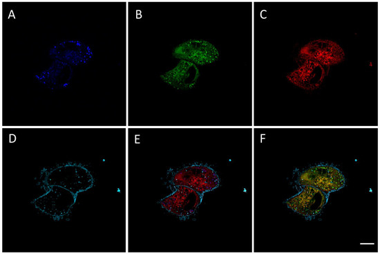 Confocal imaging of RM-581-Fluo in PC-3 cells. Representative image from confocal microscopy experiments in PC-3 cells at 60× magnification showing one focal plane. Cells treated for 2 h with 15 µM of RM-581-Fluo prior microscopy. (A) Cellular localization of RM-581-Fluo in blue (λex 405 nm, λem 460/50 nm); (B) cellular localization of RM-581-Fluo in green (λex 405 nm, λem 525/50 nm); (C) cellular localization of ER-Tracker in red (λex 561 nm, λem 593/40 nm); (D) cellular localization of Cell-mask in cyan (λex 642 nm, λem 700/75 nm); (E) merged images A, C, and D showing localization of RM-581-Fluo (blue), ER tracker (red) and Cell-mask (cyan); (F) merged images B, C, and D showing localization of RM-581-Fluo (green), ER tracker (red), Cell-mask (cyan), and colocalization of RM-581-Fluo and ER-Tracker (yellow). Scale bar: 10 µm. Three additional confocal images from a second experiment with RM-581-Fluo in PC-3 cells are shown in Figure S3, Supplementary Materials).