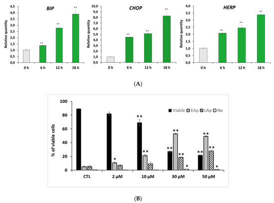 PC-3 cells were treated in a time-course manner with RM-581 (5 µM), and the transcript levels of several markers of ER-stress related apoptosis (BIP, CHOP, and HERP) were analyzed by qPCR. RM-581 considerably raised the presence of BIP, CHOP, and HERP transcripts, which are the classical ER-stress apoptosis markers (Figure 3A) [35,36]. To assess the effect of RM-581 on PC-3 cell death, we proceeded with cell characterization by flow cytometry (Figure 3B). We observed a significant and increasing proportion of apoptotic cells (early and late) from 2 to 50 µM concentrations. At 30 and 50 µM, a major proportion of the cells entered the apoptotic stage. Consequently, viable cells dropped from 95% to 20% according to RM-581 concentration. No significant proportion of necrotic cells were observed at the different tested doses.