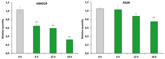 The effects of RM-581 (5 µM) on the expression of representative genes of the mevalonate and fatty acids (FA) biosynthesis pathways (HMGCR and FASN) were measured 6, 12, and 18 h after the treatment of PC-3 cells. A significant decrease in the mRNA expression of both genes was observed at the three time points for HMGCR, and at 12 and 18 h for FASN (Figure 4).