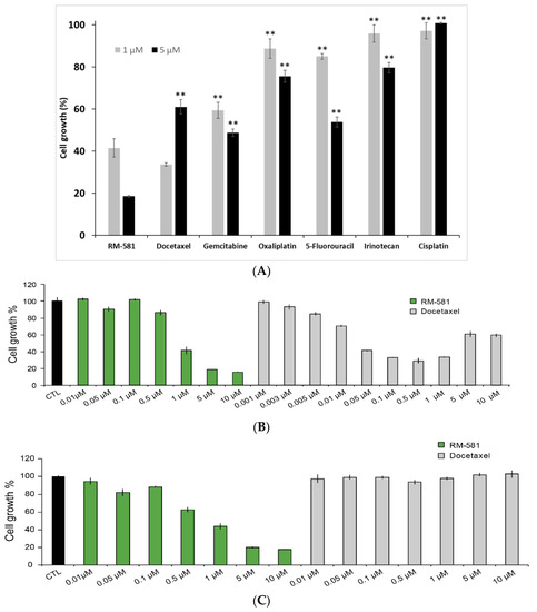 The anticancer activity of RM-581 was first compared to a selection of six antineoplastic drugs used for the treatment of prostate cancer and other cancer types (Figure 5A). RM-581 was significantly more active than all the drugs tested at 1 and 5 µM except for docetaxel tested at 1 µM, which showed slight but significantly higher potency. As a second step, we performed an assay using multiple concentrations from 1 nM to 10 µM to better compare the anticancer potency between RM-581 and docetaxel (Figure 5B), a cytotoxic agent established in the last few decades as a gold standard for metastatic CRPC cases [8,10,11,17,18]. In this assay and others, the antiproliferative activity of docetaxel showed an unexpected profile depending on concentration. We observed a dose-response from 0.001 to 0.05 µM, a plateau from 0.05 to 1 µM, and lower cytotoxicity at higher concentrations of 5 and 10 µM.