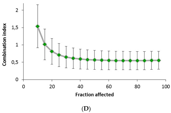 where denominators (Dx)l and (Dx)2 are the doses of the individual drug required to achieve a given effect level, and numerators (D)1 and (D)2 are the concentrations of each drug present in combination to trigger the same effect level. When the drugs additively interact, CI = 1, CI < 1 indicates a synergistic interaction and CI > 1 indicates an antagonistic effect.