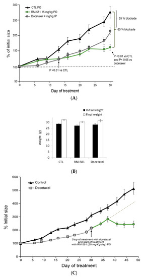 Human tumorigenic PC-3 cells were inoculated in nude mice to generate xenografts. In this in vivo cancer model, the mean tumor size of the control group nearly tripled (275%) from its initial size (100%) after 30 days (Figure 6A). However, tumor growth in mice treated orally by gavage (PO) with RM-581 (15 mg/kg) was blocked by 65% (tumor size = 155%), and RM-581 was significantly superior to docetaxel (4 mg/kg) given intraperitoneally (IP), which showed a blockade of only 35% (tumor size = 210%). The blockade effect became significant from day 13 for both treated groups. However, tumor growth blockades with docetaxel and RM-581 remained similar up to day 23, from where the response to docetaxel relapsed to an approximately half-effective blockade at day 30 compared to RM-581. Considering the toxicity of docetaxel in mice with a maximal tolerable dose of 15 mg/kg [38], and to ensure the viability of mice throughout the protocol, we used a lower dose of docetaxel (4 mg/kg/twice a week) than the 15 mg/kg/day used for RM-581. The body weight of mice was not significantly affected after 30 days of treatment in the two treated groups (Figure 6B), which agreed with previous results showing a nontoxic profile for RM-581 in mice and tissue [20,27].