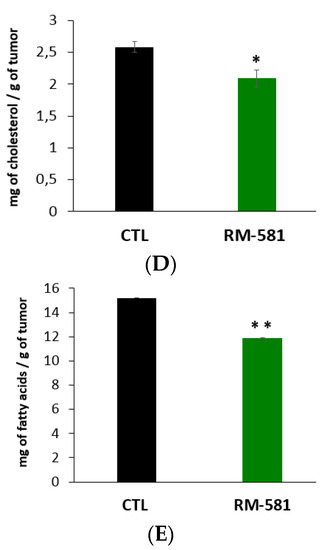 As complementary data to this in vivo protocol, we also measured the concentration of key lipids in PC-3 tumors after 30 days of treatment, knowing that ER stress induction could impact lipid levels [39]. As a result, RM-581 led to a significant decrease in cholesterol levels (−19.0%) and fatty acids (FA) (−21.8%) in tumors (Figure 6D,E). The level of FA represents a large panel of 56 saturated or unsaturated FA measured by GC-MS (see Table S3, Supplementary Materials, for a detailed list of all FA and their levels).