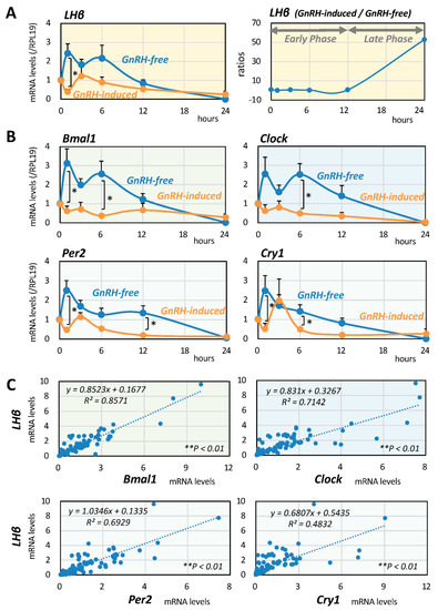 Serial changes in and interrelationships between LH and Clock gene expression induced by GnRH in mouse gonadotrope cells. LβT2 cells (1 × 105 cells/mL) were cultured with GnRH (10 nM) in serum-free DMEM for 24 h. At serial time points from 1 to 24 h, total RNAs were extracted, and the mRNA levels of (A) LHβ and (B) Bmal1, Clock, Per2, and Cry1 genes were standardized by RPL19 levels and expressed as fold changes. Results are shown as means ± SEM and were analyzed by the unpaired t-test: * p < 0.05 between the indicated groups. Ratios of LHβ mRNA levels in the presence of GnRH (10 nM) to those in the absence of GnRH at each time point are shown in the right panel of (A). (C) Cells (1 × 105 cells/mL) were treated with GnRH (10 nM) in serum-free conditions for 24 h. At serial time points from 1 to 24 h, total RNAs were extracted, and linear regression analysis was performed to determine the interrelationships between mRNA levels of LHβ and Clock genes. * p < 0.05 and ** p < 0.01 of the significant correlations.