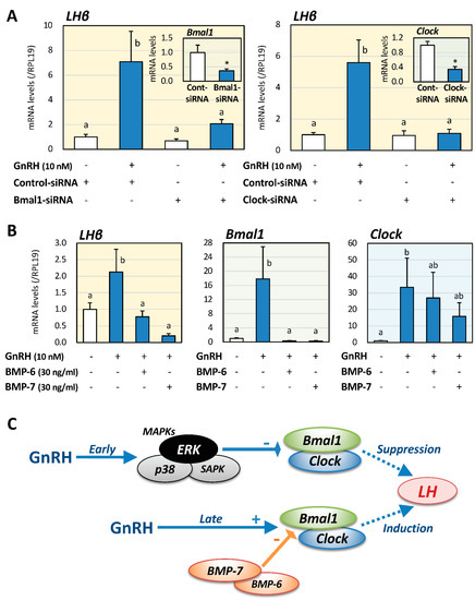 Effects of Clock gene suppression and BMPs on LH and Clock genes expression induced by GnRH in gonadotrope cells. (A) LβT2 cells (1 × 105 cells/mL) were transiently transfected with Bmal1- or Clock-specific RNA or control siRNA and then incubated with or without GnRH (10 nM) for 24 h. Total RNAs were extracted, and the mRNA levels of Bmal1, Clock and LHβ were standardized by RPL19 levels and expressed as fold changes. (B) Cells (1 × 105 cells/mL) were treated with BMP-6 and -7 (30 ng/mL) in serum-free DMEM in the presence or absence of GnRH (10 nM). After 24 h culture, total RNAs were extracted, and the mRNA levels of LHβ, Bmal1, and Clock mRNA were standardized by RPL19 levels and expressed as fold changes. Results are shown as means ± SEM. The results were analyzed by the unpaired t-test or ANOVA. The values with different superscript letters are significantly different at p < 0.05, and * p < 0.05 between the indicated groups and vs. control groups. (C) Biphasic effects of Clock genes and BMPs on GnRH-induced LH expression by gonadotrope cells. GnRH stimulation exhibits inhibitory effects on Bmal1/Clock expression at the early phase via the ERK pathway, leading to suppression of LH expression. At the late phase of GnRH stimulation, GnRH increases LH mRNA expression via upregulation of Bmal1/Clock expression, with BMP-6 and -7 suppressing the expression of Bmal1 induced by GnRH. Thus, phase-dependent roles of MAPK and BMPs in Clock gene-dependent LH expression induced by GnRH were shown in gonadotrope cells.