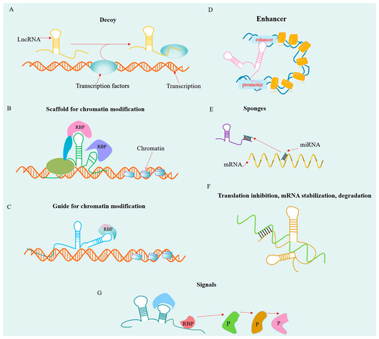 The molecular mechanisms of lncRNAs regulating cellular processes. (A) lncRNAs can act as decoys to facilitate transcription; (B,C) lncRNAs can seve as a scaffold or guide for chromatin modification; (D) lncRNAs promote R-loop formation to facilitate transcription; (E) lncRNAs can seve as ceRNAs by sponging to miRNA; (F) lncRNAs can regulate mRNA translation, stability, and degradation; (G) Signals—the RBP association with lncRNAs can contribute to conformational alterations that activate signal molecules.