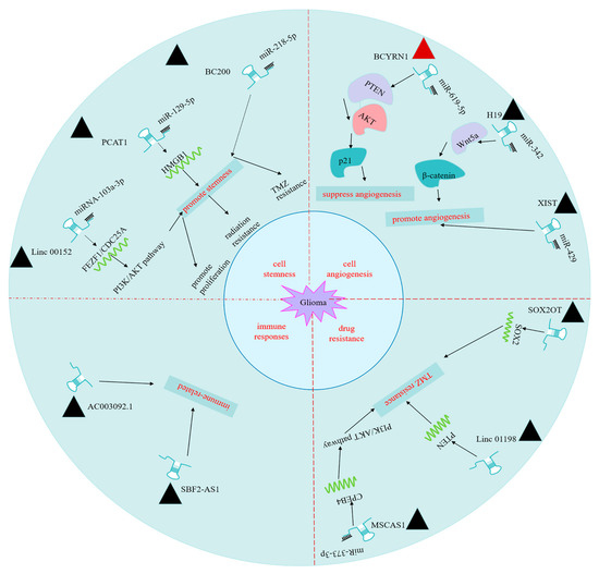 Recent studies demonstrated that, compared with nontumoral brain tissues, a large number of lncRNAs are aberrantly expressed in glioma [44,45]. In addition, the differential expression of lncRNAs is widely implicated in the occurrence, metastasis, and drug resistance of gliomas [45,46]. In the following sections, the biological functions of well-characterized lncRNAs in glioma are summarized (Figure 3).