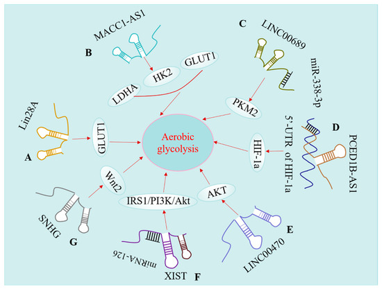 Recent studies demonstrated that numerous lncRNAs play critical roles in cancer metabolism. Understanding the relationship between lncRNAs and aerobic glycolysis can provide new strategies for cancer treatment [13,14,15]. More and more lncRNAs have been functionally characterized in aerobic glycolysis of glioma, suggesting that lncRNAs modulate the aerobic glycolysis of glioma (Figure 4).