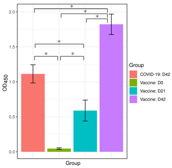 Anti-SARS-CoV-2 antibodies were measured using the Coronapass ELISA test (Figure 1, Table S1). Samples used for this analysis were collected on days 21 and 42 after the first dose of vaccine and labeled as D21 and D42, respectively. The day of the first vaccine dose was indicated as day 0 and marked as D0. The analysis of D21 samples confirmed that the first dose of SputnikV elicited an antibody response, while the second dose boosted antibody production. These data indicate that SputnikV is immunogenic after a single dose. However, the second dose boosts antibody response significantly higher as compared to the first dose.