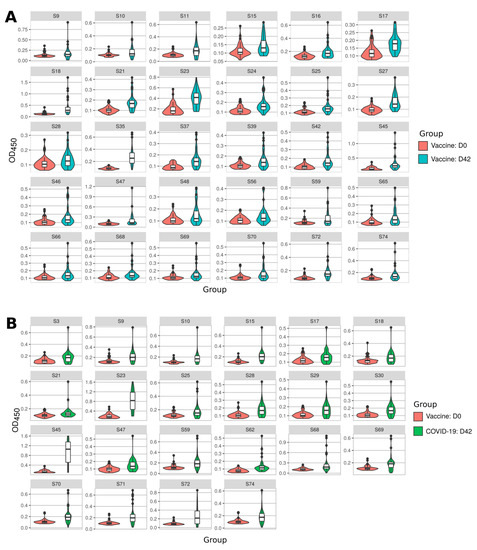 We analyzed the immune response to SARS-CoV-2 S protein peptides in vaccinated and convalescent COVID-19 sera (Figure 2). On D42 after the first dose of the vaccine the sera had higher reactivity to 30 peptides (S9, S10, S11, S15, S16, S17, S18, S21, S23, S24, S25, S27, S28, S35, S37, S39, S42, S45, S46, S47, S48, S56, S59, S65, S66, S68, S69, S70, S72 and S74) as compared to the same individuals before vaccination (D0) (Figure 2A). Those who had recovered from COVID-19 had an increased reactivity to 22 peptides (S3, S9, S10, S15, S17, S18, S21, S23, S25, S28, S29, S30, S45, S47, S59, S62, S68, S69, S70, S71, S72 and S74) when compared to control sera collected before vaccination (Figure 2B).