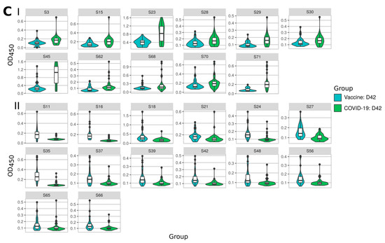 Reactivity to SARS-CoV-2 S protein peptides in SputnikV vaccinated and convalescent sera. Serum samples (40 samples) were collected on D0 and D42 after SputnikV immunization. Serum from convalescent COVID-19 patients (40 samples) was collected between 32 and 65 days after recovery (42.0 ± 11.1 days). Data are presented as Violin plots with boxplots of measured OD650 values. (A) SARS-CoV-2 peptide reactivity to sera before (D0) and after (D42) SputnikV vaccination. (B) SARS-CoV-2 peptide reactivity to (D0) vaccination and convalescent COVID-19 sera. (C) SARS-CoV-2 peptide reactivity between SputnikV vaccinated (D42) and convalescent COVID-19 sera. (C-I) reactivity to SARS-CoV-2 peptides was higher in COVID-19 convalescent as compared to vaccinated sera; (C-II) reactivity to SARS-CoV-2 peptides was higher in vaccinated as compared to COVID-19 convalescent sera. All presented peptides have statistically significant differences in comparison groups (p < 0.05, Kruskal–Wallis test).