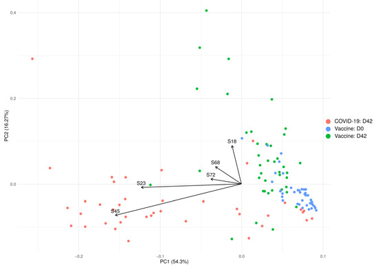 PCA based on the levels of anti-SARS-CoV-2 antibodies in SputnikV vaccinated and convalescent COVID-19 sera. The top five variables (arrows) with the highest contribution are presented. PCA reduces the dimension of multidimensional data (46 peptides) to two (2 axis—PC1 and PC2), which could be visualized with minimal loss information.
