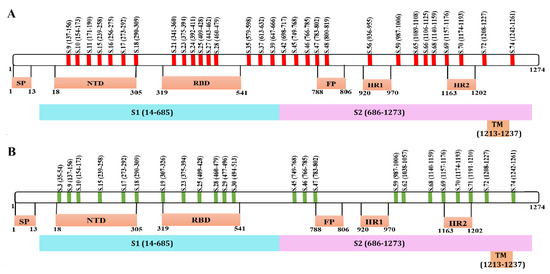 Schematic presentation of SARS-CoV-2 S protein peptides reacting with SputnikV immunized and convalescent COVID-19 sera. Location of peptides recognized by (A) SputnikV immunized serum and (B) convalescent COVID-19 sera.