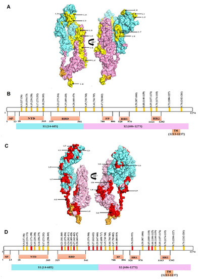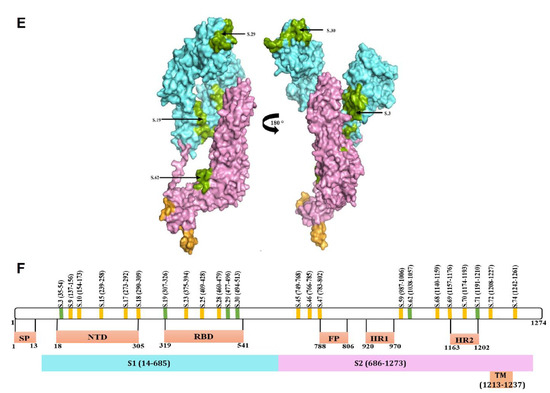 Seventeen peptides that were recognized in both vaccinated and COVID-19 convalescent sera were mapped on the three-dimensional model of S protein (Figure 5A; yellow). Eight of these peptides were located on the S1 subunit, from which five (S9, S10, S15, S17 and S18) and three (S23, S25 and S28) peptides were present in NTD and RBD domains, respectively (Figure 5A,B). Nine peptides were present in the S2 and TM domains, where FP and HR2 contain one (S47) and two (S69 and S70) peptides recognized in both immunized and convalescent sera, respectively.