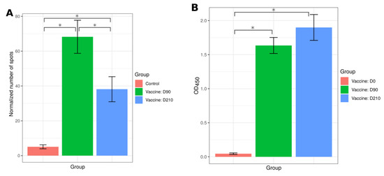 Analysis of the T cell and humoral immune response at day 90 (D90) and day 210 (D210) after SputnikV vaccination. (A) T cell immune response. PBMCs from 26 vaccinated (D90 and D210) and 12 SARS-CoV-2 antibody-negative controls were used to analyze T cell immune response using the Tigra test SARS-CoV-2 kit (Generium Corporation, Vladimir region, Russia). Spots were counted, the background (spots in unstimulated PBMCs) was subtracted, and results were presented as a normalized number of spots. (B) Forty serum samples were collected at day 0 (D0), day 90 (D90) and day 210 (D210) of SputnikV vaccination. Anti-SARS-CoV-2 IgM, IgG and IgA antibodies were detected using the Coronapass ELISA kit (BioPalitra, NextGene Russia). Data are presented as Mean ± SEM (standard error of the mean). Y-axis shows OD450 value (Coronapass ELISA kit; BioPalitra, NextGene Russia) * statistical significance.