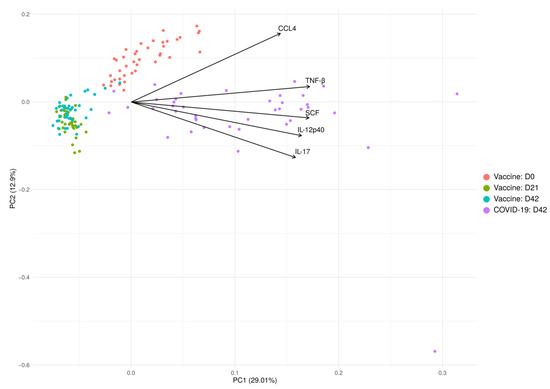 Cytokines are biologically active molecules essential for the induction, maintenance and long-term support of the immune response [31,32]. These molecules are produced upon exposure to an antigen, which can be introduced via natural (infection) or artificial (vaccination) exposure [31,33,34,35]. To determine whether cytokine activation in COVID-19 convalescent and SputnikV immunized individuals is similar, we analyzed the serum level of 48 cytokines. The PCA analysis revealed that changes in serum cytokines are similar in vaccinated individuals at D21 and D42, forming a single, well-defined cluster (Figure 7). In contrast, more variations in cytokine levels were identified in COVID-19 serum 42.0 ± 11.1 days after infection. These data suggest that cytokine activation due to SputnikV vaccination is more uniform as compared to that after infection.