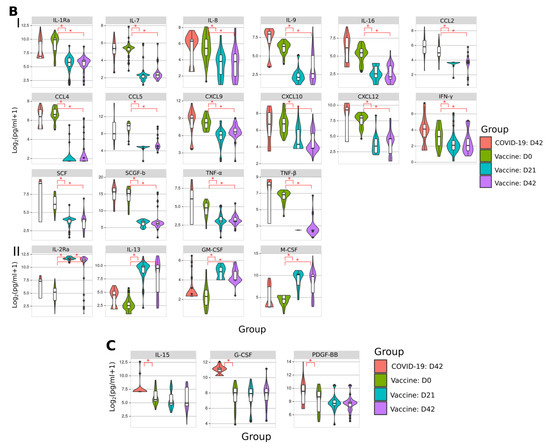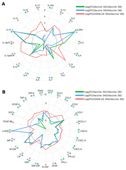 Next, we analyzed changes in serum cytokine levels in SputnikV vaccinated individuals at 21 (D21) and 42 (D42) days after the first dose (D0) of the vaccine (Figure 8A,B). We have found that 14 cytokines were increased (IL-1α, IL-2Ra, IL-3, IL-10, IL-12p70, IL-13, CCL7, IFN-α2, bFGF, GM-CSF, LIF, M-CSF, b-NGF and TRAIL), while 25 cytokines were decreased (IL-1Ra, IL-2, IL-4, IL-5, IL-7, IL-8, IL-9, IL-12p40, IL-16, IL-17, CCL2, CCL3, CCL4, CCL5, CCL11, CXCL9, CXCL10, CXCL12, IFN-γ, HGF, MIF, SCF, SCGF-b, TNF-α and TNF-β) in serum 21 days after immunization as compared to D0. The pattern of activated cytokines remained mainly similar 42 days after vaccination, where the level of 12 cytokines were higher (IL-1α, IL-2Ra, IL-10, IL-12p70, IL-13, CCL7, IFN-α2, GM-CSF, LIF, M-CSF, b-NGF and TRAIL) and 26 cytokines were lower (IL-1Ra, IL-2, IL-4, IL-5, IL-6, IL-7, IL-8, IL-9, IL-12p40, IL-16, IL-17, CCL2, CCL3, CCL4, CCL5, CCL11, CXCL9, CXCL10, CXCL12, IFN-γ, HGF, MIF, SCF, SCGF-b, TNF-α, TNF-β) as compared to serum before vaccination. Overall, 12 cytokines (IL-1α, IL-2Ra, IL-10, IL-12p70, IL-13, CCL7, IFN-α2, GM-CSF, LIF, M-CSF, b-NGF and TRAIL) remained activated after first (D21) and second (D42) doses of vaccine. Twenty-five cytokines (IL-1Ra, IL-2, IL-4, IL-5, IL-7, IL-8, IL-9, IL-12p40, IL-16, IL-17, CCL2, CCL3, CCL4, CCL5, CCL11, CXCL9, CXCL10, CXCL12, IFN-γ, HGF, MIF, SCF, SCGF-b, TNF-α and TNF-β) were consistently lower in immunized individuals as compared to that before the vaccination. Interestingly, serum levels of IL-6, a cytokine identified as playing an essential role in the pathogenesis of COVID-19 [36], were decreased after the second dose of vaccine.
