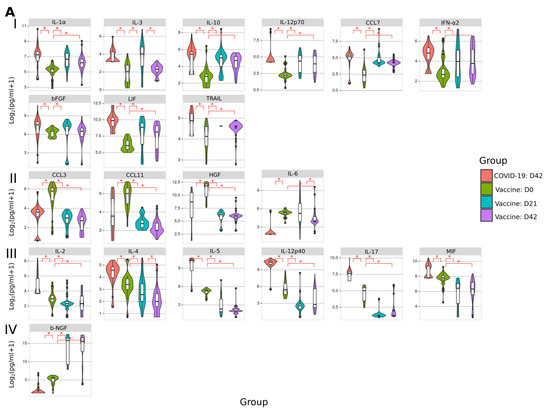 Analysis of cytokines in SputnikV vaccinated and convalescent COVID-19 sera. Serum samples from SputnikV (D21 and D42), as well as 42.0 ± 11.1 days (median ± SEM) after COVID-19 convalescence, were used to analyze 48 cytokines (Bio-Plex Pro Human Cytokine 48-plex Screening Panel). Each sample was tested in triplicate. Data collected was analyzed with MasterPlex CT control software and MasterPlex QT analysis software (MiraiBio, San Bruno, CA, USA). (A) Cytokines affected in SputnikV vaccinated and convalescent COVID-19 sera. (A-I) cytokines increased after vaccination and convalescent COVID-19; (A-II) cytokines decreased after vaccination and convalescent COVID-19; (A-III) cytokines decreased after vaccination, while increased in convalescent COVID-19; (A-IV) cytokines increased after vaccination, while decreased in convalescent COVID-19. (B) Cytokines are affected only after vaccination. (B, I) cytokines decreased after vaccination while not changing in convalescent COVID-19; (B, II) cytokines increased after vaccination while not changing in convalescent COVID-19. (C) cytokines not changed in vaccinated, while increased in convalescent COVID-19. Asterisks (*) indicate statistically significant differences between cytokines (p < 0.05, Kruskal–Wallis test).