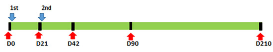 Samples were collected before the first dose vaccine day 0 (D0), as well as day 21 (D21) and day 42 (D42) days after the first dose vaccine. Additionally, follow up samples were collected on day 90 (D90) and day 210 (D210) after the first dose of the vaccine.