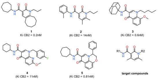 Chemical structures of reported pyridone/quinolone based CB2R ligands and target compound.