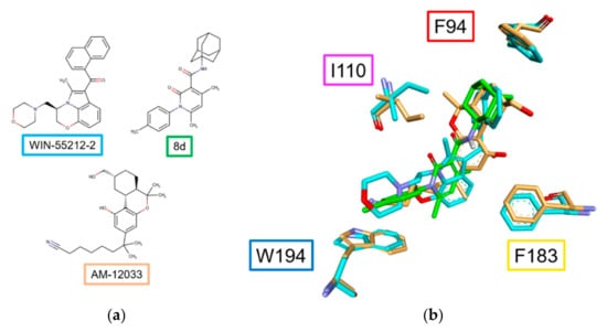 (a) Structurally different CB2R agonists; (b) Superposition of the CryoEM structure of CB2R with bound agonist WIN-55212-2 (PDB:6PT0, both cyan), the crystal structure of CB2R with the selective agonist AM12033 (PDB:6KPC, both orange) and the predicted binding pose of 8d (green). Residues F94 (red, cavity 1) W194 (blue, cavity 2), F183 (yellow, cavity 3) and I110 (magenta, common residue) are shown for spatial references.