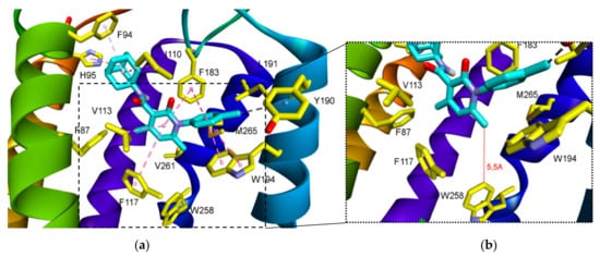 (a) Predicted binding mode of compound 8d in CB2R. Hydrophobic and π-π interactions are shown in dashed lines; (b) Distance between W258 residue and 8d.