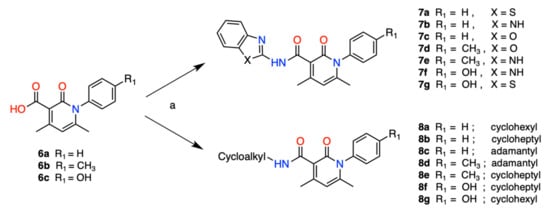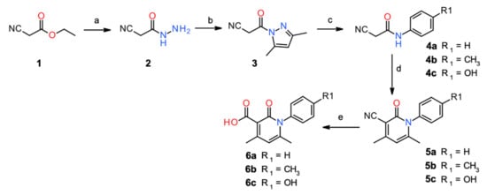 All compounds were synthesized as shown in Scheme 1. Firstly, three N-aryl-4,6-dimethyl-2-oxo-1,2-dihydropyridine-3-carboxylic acids were synthesized from compound 3 using different substituted anilines (step c, Scheme 1) to obtain the corresponding substituted amides 4a, 4b and 4c. These amides were cyclized using acetylacetone and piperidine as a catalyst to yield compounds 5a, 5b and 5c. The pyridone derivatives were then hydrolyzed using potassium hydroxide in ethanol 80% under reflux heating obtaining the carboxylic acids derivatives 6a, 6b and 6c.