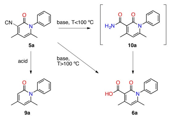 It is noteworthy to mention that hydrolysis of the nitrile derivatives proved to be harder than expected and both acid and basic conditions were studied. As described in Scheme 2, different side products were obtained depending on the reaction conditions. Only decarboxylated product 9a was obtained under acidic medium while under basic medium, the obtained product depended upon the reaction temperature. Heating the reaction below 100 °C stopped the reaction at the amide intermediate 10a whereas heating the reaction above 100 °C completely hydrolyzed the precursors to product 6a (95% relative yield).