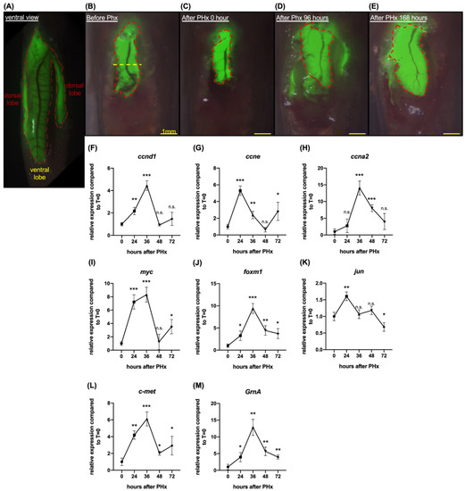 Liver regeneration was induced by one-half ventral lobe partial hepatectomy in 7 days. (A) Ventral view of Tg(fabp10:EGFP). The green fluorescent area marked by the red dotted line is the liver of Tg(fabp10:EGFP). (B) Schematic diagram of one-half ventral lobe partial hepatectomy (PHx). The regenerating ventral lobe is shown at 0 h (C), 96 h (D), and 168 h (E) after PHx. Area marked by the red dotted line is the liver ventral lobe. Yellow dotted line, the site of PHx. Scale bar: 1 mm. Gene expression was examined by quantitative PCR. Cell cycle regulatory genes included (F) ccnd1, (G) ccne, and (H) ccna2. Cell proliferation-associated genes included (I) myc, (J) foxm1, and (K) jun. (L) Gene expression of c-met. (M) Gene expression of GrnA. The relative expression levels compared to control at 0 h PHx are presented as mean ± SD. Significance was set at * p < 0.05, ** p < 0.01, *** p < 0.001, as determined by t-test; PHx, partial hepatectomy.