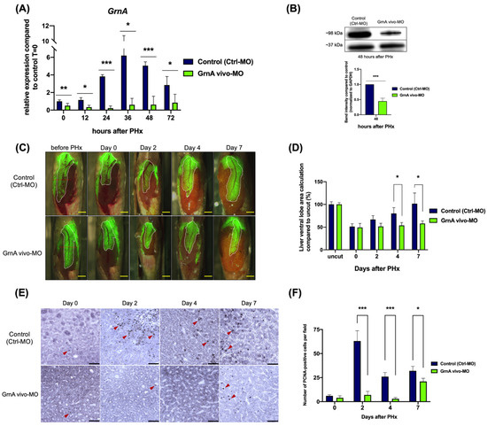 GrnA morphant exhibited impaired liver regeneration after PHx. (A) GrnA gene expression was examined by quantitative PCR after PHx. The relative expression levels are presented as mean ± SD, compared to control group at 0 h PHx. (B) Protein levels of GrnA and GAPDH were examined by Western blot analysis at 2 days after PHx. GrnA protein levels were normalized to GAPDH and then fold-change was calculated compared to control group. The values are presented as mean ± SD. (C) Partial hepatectomy in control (upper) and GrnA morphant (lower) was carried out on day 0. The regenerating liver ventral lobe is shown at 2, 4, and 7 days after PHx. White dotted line indicates liver ventral lobe. Red dotted line shows the site of PHx. Scale bar: 1 mm. (D) Liver ventral lobe area after PHx is shown in (C). The area was normalized to control uncut group and presented as percentage; mean ± SD. (E) Immunohistochemical staining of PCNA in liver ventral lobe at 0, 2, 4, and 7 days after PHx. Red arrowhead indicates the PCNA-positive cells. Scale bar: 50 μm. (F) Number of PCNA-positive cells was quantified after PHx, as shown in (E). The data are presented as mean ± SD. Significance was set at * p < 0.05, ** p < 0.01, *** p < 0.001, as determined by t-test; PHx, partial hepatectomy.
