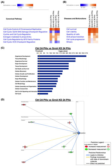 Canonical pathway, and functional and gene interaction network analyses of control and GrnA Mo-treated animals at 0, 24, and 36 h after PHx. (A) Heatmap shows canonical pathway analysis in comparison to control and GrnA Mo treatments at 24 and 36 h after PHx versus 0 h after PHx. (B) The heatmap shows disease and biofunctional analyses of control and GrnA Mo treatment at 24 and 36 h after PHx versus 0 h after PHx. Activation z-score indicates activation states of upstream transcriptional regulators: “activated” (orange) or “inhibited” (blue). Significantly activated or inhibited indicates an overlap p-value ≤ 0.05 and an z-score ≥ 1.5 (or ≤−1.5). (C) The top ranked diseases and biofunctions in control Mo versus GrnA Mo treatment at 24 h PHx. The threshold line represents a p-value of 0.05. (D) The gene interaction network was predicted for liver regeneration. The lines represent direct or indirect gene-to-gene interactions, and the color represents fold change. The pathway, functional analyses, and network analyses were generated using IPA. * more than one ID linked to this gene.