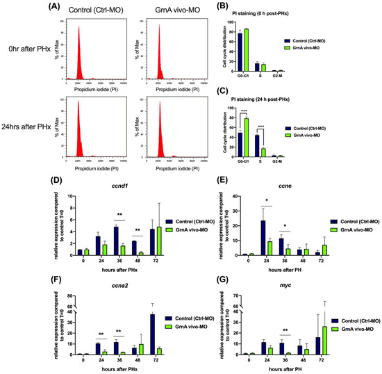According to transcriptomic analysis results, activation of the cell cycle and cell proliferation is a major event in liver regeneration. We therefore measured the proportions of hepatocytes in different stages of the cell cycle in GrnA morphants after PHx. Hepatocytes were isolated at 0 h and 24 h after PHx and stained with propidium iodide (PI) for cell cycle analysis by flow cytometry (Figure 4A). The proportions of cells at each stage of the cell cycle were not different between control and GrnA morphants at 0 h after PHx (Figure 4B); however, GrnA morphants showed increased percentages of cells at G0-G1 phase (78.9%) and decreased cell proportions in the S phase (17.4%) compared to the G0-G1 phase (49.5%) and the S phase (44.6%) of controls (Figure 4C). This result suggested that the G1/S transition might not occur, and cell proliferation might be suppressed in GrnA morphants. Therefore, G1/S-associated cyclin genes, including ccnd1 and ccne, were selected for examination. In addition, ccna2, which peaks in middle of S phase, was also examined. The ccnd1 expression levels in GrnA morphants were significantly decreased compared with control group at 36 and 48 h after PHx, and their expression peaked late at 72 h after PHx (Figure 4D). The ccne expression levels in the control group at 24 h and 36 h after PHx were dramatically activated, with 23.5-fold and 11.5-fold upregulation compared to 0 h after PHx, respectively. However, the expression pattern in GrnA morphants was flat, and the difference was especially obvious at 24 h and 36 h after PHx (Figure 4E). The ccna2 expression levels of the control group peaked at 37.7-fold higher than 0 h after PHx; however, expression levels in the GrnA morphant were not highly elevated at 24 h and 36 h after PHx (Figure 4F). We also examined myc expression, a transcription factor involved in cell proliferation, and the results showed that the increasing myc expression levels ranged from 8.4-fold to 16.1-fold higher at 12 h to 72 h in comparison with 0 h after PHx. Conversely, myc expression in the GrnA morphant was not elevated as much as in the control group at 36 h after PHx (Figure 4G). These results indicate that the GrnA morphant not only maintained G1/S cell cycle arrest by a lack of ccnd1, ccne, and ccna2 upregulation, but it also had low cell proliferation according to lack of myc activation.