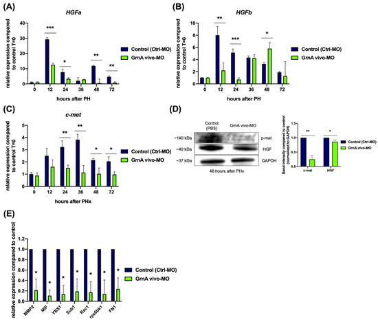 The transcriptome analysis suggested that a regulatory relationship may exist between GrnA and HGF/c-met axis after PHx. To clarify this mechanism, we examined the expression levels of HGFa and HGFb, which are paralogous genes in zebrafish, as well as c-met. HGFa expression showed peaks at 12 h and 48 h after PHx, with 29.3-fold and 11.8-fold upregulation compared to 0 h after PHx. The peak expression levels of HGFa were much lower in GrnA morphants after PHx (Figure 5A). The HGFb expression pattern differed from HGFa after PHx, as it peaked with an eightfold higher level at 12 h after PHx and gradually declined to 1.9-fold elevation at 12 h after PHx, compared to 0 h after PHx. Similar to the HGFa result in the GrnA morphant, the HGFb upregulation was significantly lower at 12 h and 24 h after PHx than controls; however, a slightly increase was observed at 48 h after PHx in comparison with controls (Figure 5B). The HGF-specific receptor, c-met, also showed expression levels from 24 h to 72 h after PHx that were lower in GrnA morphants than controls (Figure 5C). Next, we examined the protein levels of HGF and c-met in GrnA morphants at 48 h after PHx by Western blotting. The results showed that c-met and HGF protein expression levels were lower than the control group, at 0.25-fold and 0.86-fold compared to controls, respectively (Figure 5D). We also examined the expression of c-met upstream genes, MMP2, MIF, and YBX1, and downstream genes, Sub1, Rac1, rps6bk1, and FN1, at 36 h after PHx. The results indicated all of these genes were significantly lower in GrnA morphants than controls (Figure 5E). Together, the results suggest a generally lower level of signaling through the HGF/c-met axis in morphants compared to controls, which would be expected to lead to impaired liver regeneration.