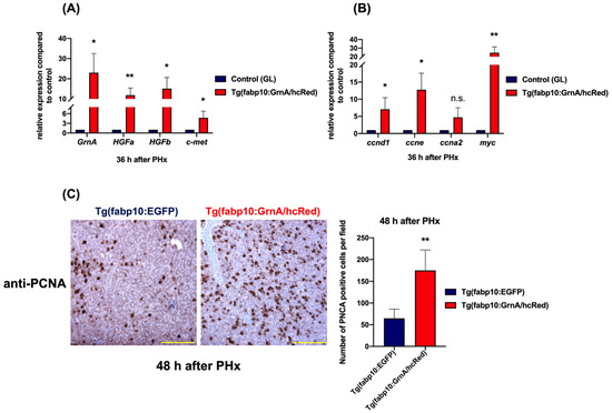 We then probed the effects on gene expression of growth factors, cell cycle-related proteins, and cell proliferation factors after PHx. The GrnA and HGF/c-met gene expression was also examined in the transgenic zebrafish after PHx. GrnA, HGFa, HGFb, and c-met were highly upregulated compared to controls, with 23-fold, 11.9-fold, 15.1-fold, and 4.7-fold differences, respectively, at 36 h after PHx, (Figure 6A). The cell cycle regulatory genes, ccnd1 and ccne, were also more highly upregulated, with sevenfold and 12.8-fold differences compared to the control group at 36 h after PHx, respectively. Interestingly, ccna2 expression was not higher in the transgenic fish compared to controls. The cell proliferation regulatory gene, myc, was upregulated, as high as 24.6-fold over control (Figure 6B). The liver regeneration was reflected by the numbers of PCNA-positive hepatocytes after PHx. Proliferating hepatocytes in liver-specific GrnA-overexpressing transgenic zebrafish were strongly increased at 2.7-fold over the number in the control group at 48 h after PHx (Figure 6C). On the basis of these results, we concluded that liver-specific overexpression of GrnA promotes hepatocyte proliferation after PHx, probably via upregulation of the HGF/c-met axis.