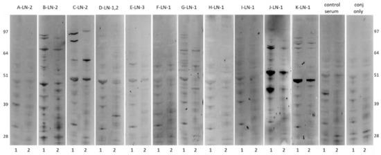 ASC probes were generated from one to three separate pelvic lymph nodes (LN1, LN2, LN3) of 11 ovarian cancer patients (A–K). The IgG concentrations of ASC probes ranged from 0.04 µg/mL to 1.05 µg/mL, excluding an outlier (C-LN1, 15.00 µg/mL) (Table 1). Western blots of ASC probes with the highest IgG content were performed against soluble (1) or insoluble (2) extracts of an ovarian cancer cell line (OVCAR3), and showed unique and shared patterns of band reactivity with higher reactivity seen in soluble fractions (Figure 1), as well as instances of no reactivity (A-LN2, H-LN1).