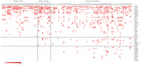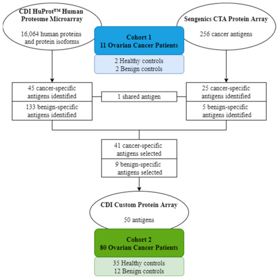 ASC probes and matched sera from ovarian cancer cohort 1 (n = 11), as well as serum from healthy (n = 2) and benign (n = 2) controls, were screened using the CDI Human Proteome (HuProtTM) array (CDI Laboratories Inc., Mayaguez, PR, USA) and the Sengenics Cancer-Testis Antigens (CTA) protein array (Sengenics Corporation, Singapore), as per the manufacturers’ instructions. Both arrays were used to ensure the maximum coverage of the human proteome and tumor antigens relevant to cancer. The CDI HuProtTM array included 16,064 human proteins and protein isoforms and was used to screen ASC probes at a 1:2 dilution and serum at a 1:500 dilution. The Sengenics CTA protein array included 256 cancer-testis and associated antigens and was used to screen ASC probes at a 1:2 dilution and serum at a 1:800 dilution. While some protein content was shared between the HuProtTM and CTA arrays (189 antigens), the protein cloning and expression methods used by each array platform differed (N-terminal GST-His-tagged proteins produced using the pEGH-A expression vector in a Saccharomyces cerevisiae strain versus BCCP-tagged fusion proteins produced in SF9 insect cells and biotinylated in vivo, respectively) [21]. These data were used to identify candidate antigens relevant to ovarian cancer, and a custom protein array including 50 candidate antigens (Table S1) was generated via CDI (CDI Laboratories Inc.). Serum samples from ovarian cancer cohort 2 (n = 80), as well as all healthy (n = 35) and benign (n = 12) controls, were screened at a 1:500 dilution using the CDI custom protein array, as per the manufacturer’s instructions (Figure 4).