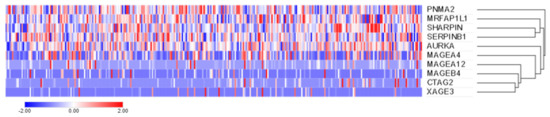 Gene expression of candidate tumor-associated and cancer-testis antigens in a separate ovarian cancer TCGA dataset. Heat map representing the hierarchical clustering using Euclidean distance of 307 ovarian serous cystadenocarcinomas (TCGA dataset) based on CTAG2, MAGEB4, SHARPIN, MAGEA12, MAGEA4, MRFAP1L1, PNMA2, AURKA, SERPINB1 and XAGE3 mRNA expression. mRNA expression is shown as Z-scores (RNA Seq V2 RSEM) with scale bar set from −2 (blue) to 2 (red).