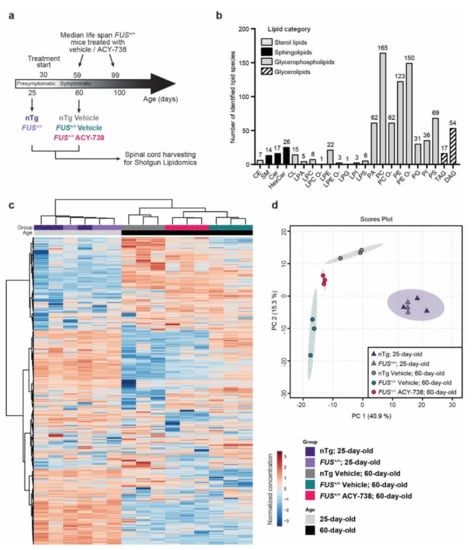 Whole spinal cord lipidome data show modifications of lipid homeostasis according to age, genotype, and treatment. (a) Schematic of the experimental design. FUS+/+ mice develop motor symptoms after 30 days of age and have a median survival of 59 days [6,21]. Treatment with ACY-738, provided in crushed food mixed with water at a dose of 100 mg/kg, extends survival to 99 days and ameliorates disease phenotype [6]. Whole spinal cords were collected for shotgun lipidomics on presymptomatic (25-day-old) nTg and FUS+/+ mice and symptomatic (60-day-old) vehicle-treated nTg and vehicle- or ACY-738-treated FUS+/+ mice. (b) Number of identified lipid species per lipid class. Lipids classes are regrouped into four main categories. Abbreviations of the lipid classes are defined in the Supplementary Information File. (c) Heatmap representing all samples and color-coded normalized concentrations of all individual lipid species. The colors vary from deep blue to reddish-brown to indicate values below and above the mean normalized concentrations for a given lipid species, respectively. Cluster analysis was performed to display samples in columns and lipid species in rows. (d) Principal component analysis (PCA) scores plot of the whole lipidome data (15 samples; 538 lipid species).